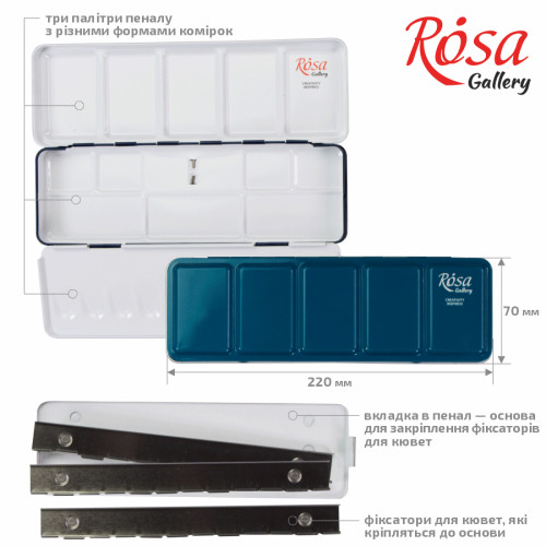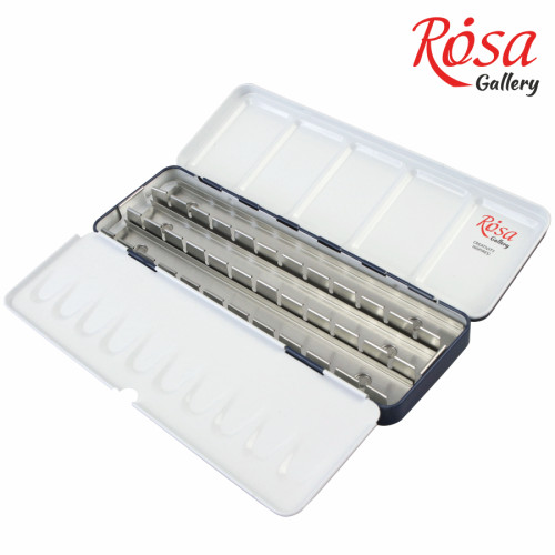 Пенал для акварелі ROSA Gallery являє собою металеву коробку, в яку вбудовані дві палітри різної конфігурації. Пенал має спеціальну вставку для кювет та зручний фіксатор для пальця на нижній кришці пеналу, який дозволяє легко утримувати фарби в руці під час роботи.