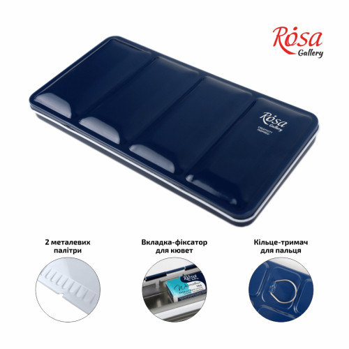 Пенал для акварелі ROSA Gallery являє собою металеву коробку, в яку вбудовані дві палітри різної конфігурації. Пенал має спеціальну вставку для кювет та зручний фіксатор для пальця на нижній кришці пеналу, який дозволяє легко утримувати фарби в руці під час роботи.