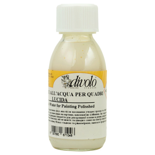 Глянцевий лак на водній основі для картин можна наносити пензлем; він не жовтіє та швидко сохне на повітрі у тонкому шарі.