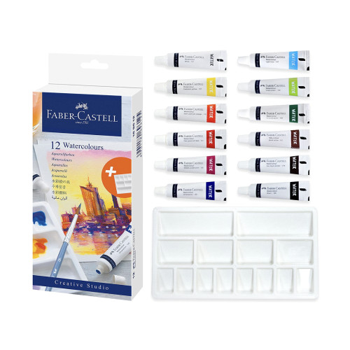 Акварель художня Faber-Castell Watercolours представлена в компактному наборі з 12 кольорів у тубах по 9 мл. До набору також входить палітра для змішування.
