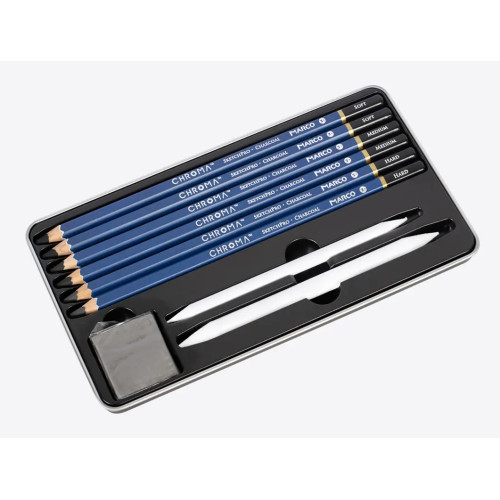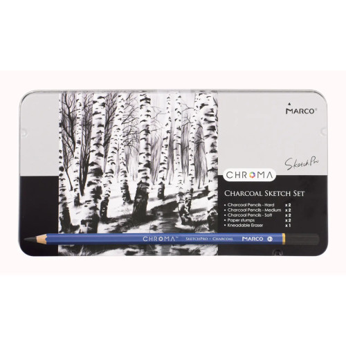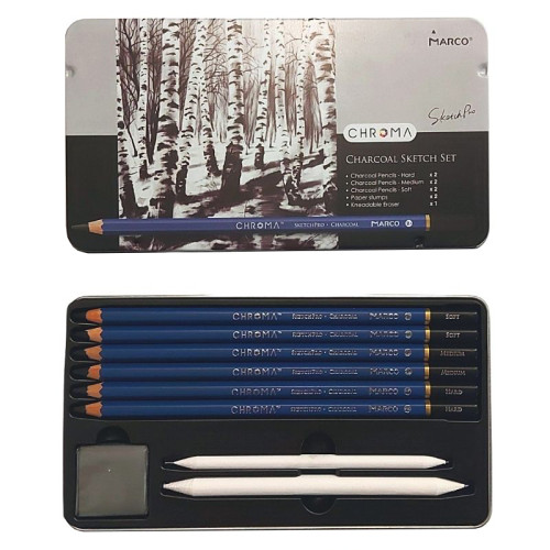 Олівці вугільні Chroma, 6 шт+2 розтуш+гумка, метал. пенал, Marco, 1041-9TN