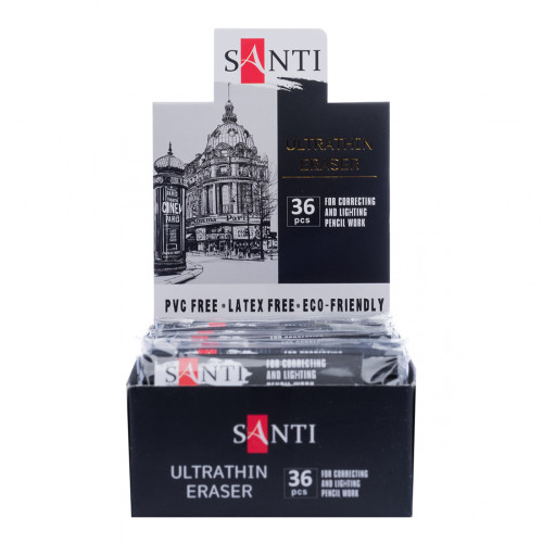 Ультратонка професійна гумка SANTI для графітних і кольорових олівців має ергономічну форму і не залишає слідів на папері після стирання. Завдяки ультратонкій грані зручна для виділення дрібних деталей і тонких ліній. Завдяки індивідуальній упаковці гумка не брудниться та більш зручна у використанні.
