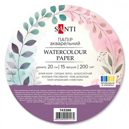 Набір ТМ SANTI містить 15 аркушів акварельного паперу діаметром 20 см, щільністю 200 г/м2, виготовленого в Німеччині зі 100% целюлози, методом холодного пресування. Витримує багатошарове нанесення фарби, не деформується і не просвічується, добре тримає колір. Текстурована, середньозерниста поверхня паперу дозволяє створювати цікаві ефекти та переходи, а її білий колір забезпечує точну передачу відтінків та насиченість фарб. Однією з переваг паперу є його безкислотний склад, який запобігає вицвітанню малюнка, завдяки цьому ваші роботи збережуть яскравість та насиченість кольорів на довгі роки. Оптимальний для різних акварельних технік, включаючи роботу пензлем, губкою та олівцем, тушшю.