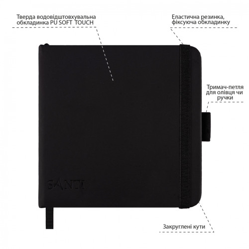 Тверда, водовідштовхувальна обкладинка з PU-матеріалу з ефектом SOFT-TOUCH захищає внутрішній блок та забезпечує зручність під час малювання. Петля-тримач для ручки або олівця гарантує, що ваш інструмент завжди буде під рукою. Всередині 56 аркушів чорного паперу щільністю 145 г/м². Завдяки безкислотному складу паперу, використаного в блокноті ТМ SANTI, ваші роботи збережуться на довгі роки. Гладка поверхня паперу з ледь відчутною текстурою забезпечує плавне ковзання олівця чи ручки по аркушу, що дозволяє створювати деталізовані й виразні роботи.