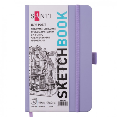 Скетчбук ТМ SANTI підходить для роботи лінерами, олівцями, тушшю, пастеллю, вугіллям, акварельними маркерами. Ідеально підходить для скетчингу, каліграфії, архітектурних ескізів та інших видів творчості.