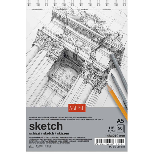 Скетчбук для ескізів та малювання, А5, 50 арк, 115 г/м2, пружина, MUSE, PB-SC-050-334