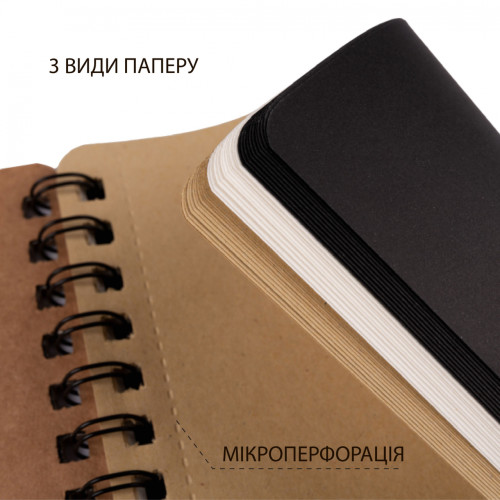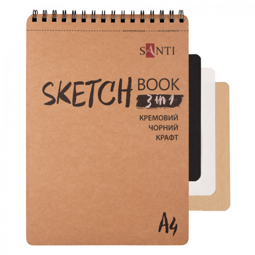 М'яка двостороння обкладинка (з одного боку чорна, з іншого крафт) надає скетчбуку стильний і лаконічний вигляд. Крім того, ви отримуєте фактично два різні скетчбуки в одному, що дозволяє зручно розділяти свої роботи за темами, техніками чи настроєм. Усередині 33 аркуші 3 видів паперу різної щільності, скріплених надійним з'єднанням на пружині, завдяки чому скетчбук відкривається на 360 градусів, що дозволяє працювати з будь-якою ділянкою сторінки без обмежень. Наявність мікроперфорації дозволяє акуратно вилучати окремі роботи - сторінки легко відриваються, не пошкоджуючи решту аркушів. Завдяки безкислотному складу паперу, що використовується в блокноті ТМ SANTI, ваші роботи збережуться на довгі роки. Потовщена картонна підложка дозволяє використовувати його як планшет і працювати без опори.