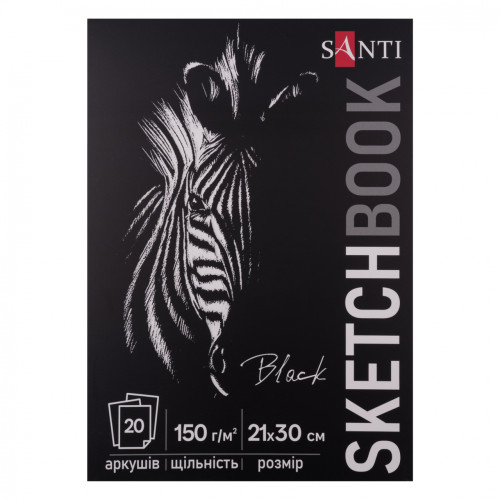 М'яка обкладинка з матовою ламінацією надає скетчбуку стильного та лаконічного вигляду. Клейове кріплення та тверда підложка забезпечують зручність використання. Потовщена картонна основа дозволяє використовувати його як планшет і працювати на вазі. Всередині 20 аркушів паперу чорного кольору щільністю 150 г/м². Завдяки безкислотному складу паперу, використаного у блокноті ТМ SANTI, ваші роботи збережуться на довгі роки, а матова поверхня паперу з ледь відчутною текстурою забезпечує плавне ковзання олівця чи ручки по аркушу, дозволяючи створювати деталізовані та виразні роботи.