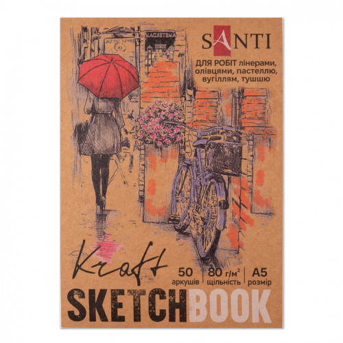 Скетчбук ТМ SANTI з крафт-папером має м'яку стильну обкладинку з атмосферним дизайном, містить 50 аркушів крафт-паперу, щільністю 80 г/м². Його натуральний коричневий відтінок і злегка шорстка, приємна на дотик текстура створює тепле тло для будь-якого малюнка, підкреслюючи контраст ліній та кольорів. Крафт-папір дуже екологічний - виготовляється з сировини з мінімальною хімічною обробкою. Завдяки безкислотному складу паперу, який використовується в блокноті ТМ SANTI, ваші роботи збережуться на довгі роки.