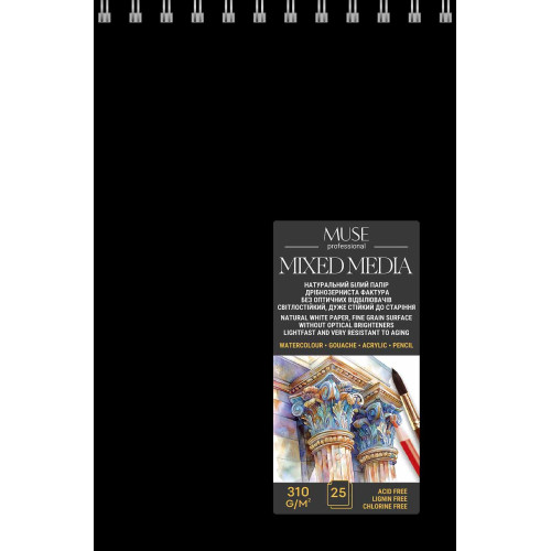 Скетчбук для змішаних технік, А5, 25 арк, 310 г/м2, пружина, MUSE, PB-SC-025-345