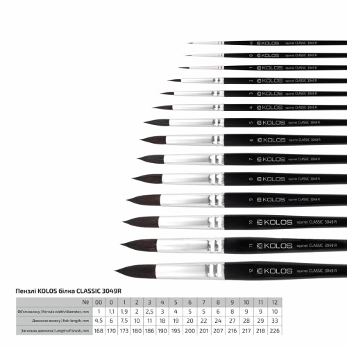Пензель круглий з волоса білки серія Classic 3049R KOLOS має м'який, тонкий і еластичний пучок, завдяки чому забезпечує бездоганний контроль над текучістю фарби, і здатність утворювати гострий кінчик.