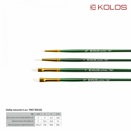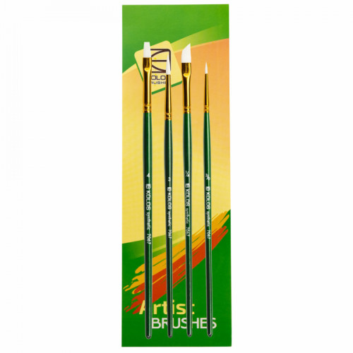 Набір синтетичних пензлів KOLOS містить у собі пензлі різних форм і розмірів, що дозволить Вам втілити в життя всі Ваші творчі ідеї, до того ж, синтетика універсальна: підійде як для водорозчинних фарб, так і для олійних і акрилу. Крім універсальності синтетика має ще одну перевагу: такі пензлі менш схильні до руйнування під впливом розріджувачів, фарб, прямих сонячних променів.