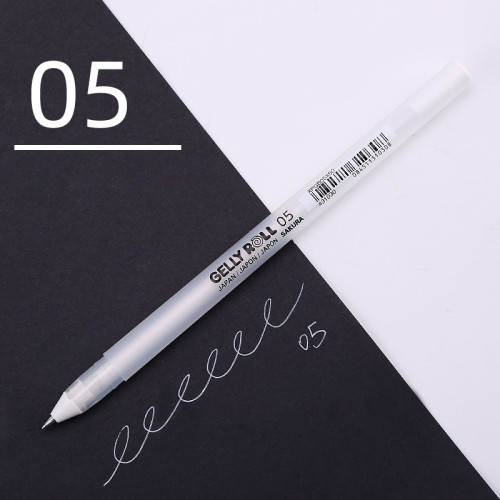 Біла гелева ручка Gelly Roll, від японського виробника Sakura, містить запатентовані чорнила PIGMA INK, які забезпечують насичений колір, водостійкість і стійкість до вицвітання (роботи, виконані ручками Gelly Roll можуть зберігатися до 100 років).