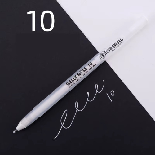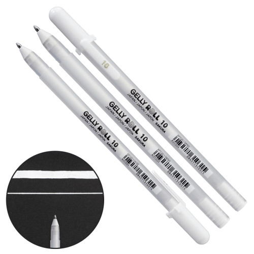 Біла гелева ручка Gelly Roll, від японського виробника Sakura, містить запатентовані чорнила PIGMA INK, які забезпечують насичений колір, водостійкість і стійкість до вицвітання (роботи, виконані ручками Gelly Roll можуть зберігатися до 100 років).